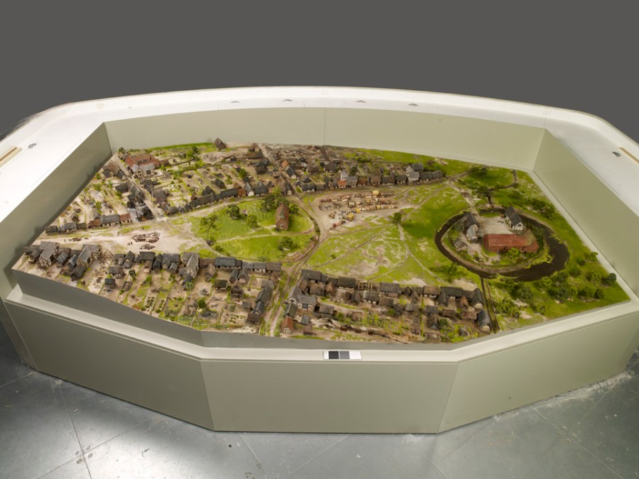 Model of medieval Birmingham in 1300. Notice the familiar triangular shape to the left of the model, which you can still see today as you walk downhill from New Street to St Martin’s Church.