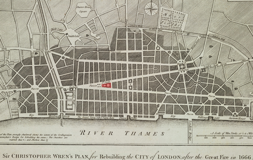 But for some like Sir Christopher Wren and the Royal Society, this was a golden opportunity. They proposed to rebuild London on the basis of an ordered grid system in place of the disordered medieval streets, but this didn’t happen for a few reasons. First, a complete redesign would have taken too long but more specifically here, the property boundaries, although now virtually impossible to pinpoint on account of the absence of the buildings, were still protected by law.