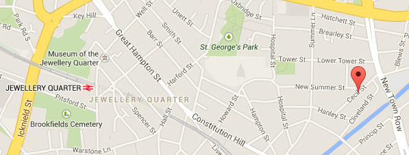 The red pin shows the location of where Caroline was living in 1861, just a stone's throw from the Jewellery Quarter.