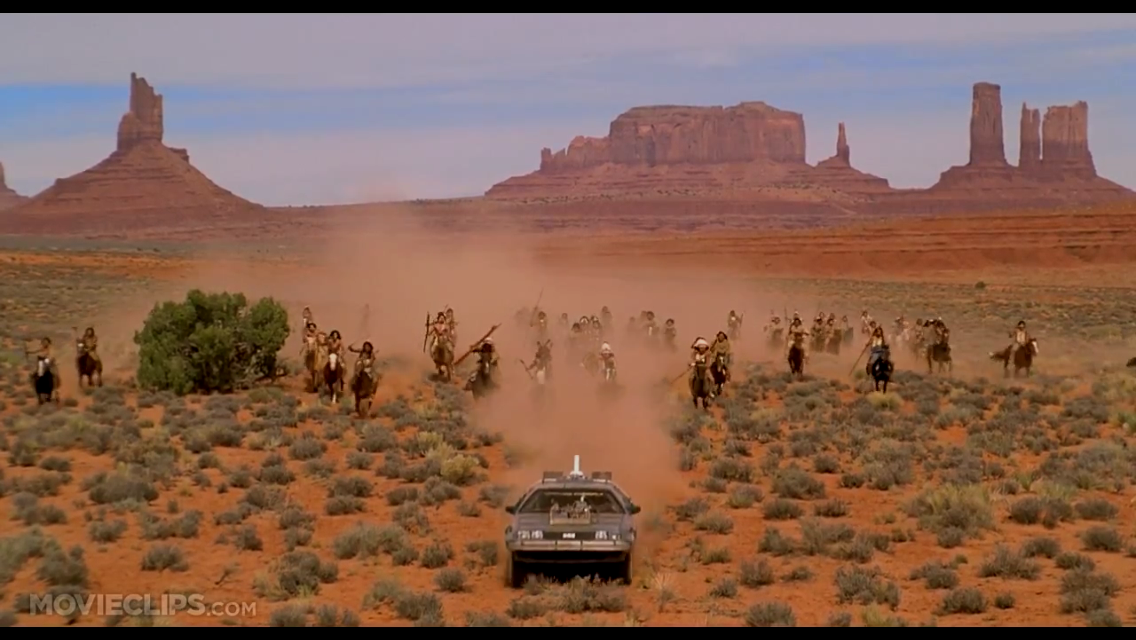Marty McFly desperately trying to ‘outrun’ the ‘Indian’ charge in Back to the Future, Part III . Source: http://movieclips.com/
