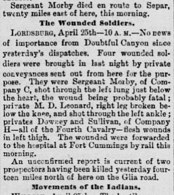 The story skips forward here yet again to April 25th 1882, when Henry, now a sergeant aged just twenty-nine years old died ‘of wounds in action with Indians on cars between Lordsburg and Separ, New Mexico’. It was the description of being killed by ‘Indians’ that initially caught my attention and led me to believe that there was something more behind the story. Granted, there were many small battles and skirmishes between cavalry and ‘Indians’ during this period, but even a skirmish can make the newspapers. Lo and behold, a simple search of ‘Lordsburg 1882’ revealed an abundance of sources from books, but more decisively generated newspaper articles, including one from the Sacramento Daily Record-Union reporting on Henry’s death. It places Henry in a conflict with Apaches on April 23rd 1882 that’s frequently referred to as the Battle of Horseshoe Canyon or Doubtful Canyon. Colonel Forsyth, who was present at the battle reported that: