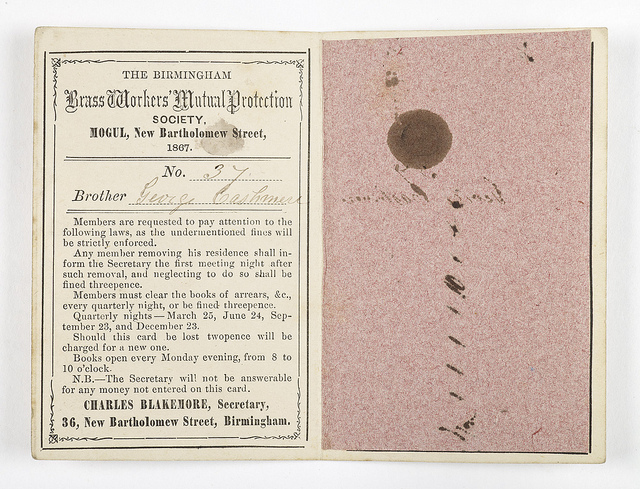Document from the Brassworkers Mutual Protection Society. A Coffin Furniture trade union did not exist until the late 1890s, so many workers engaged in this labour force would have most likely have been members of Brassfounders’ trade unions like this one, and the later Brassfounders trade union on Lionel street, just one street away from Newman Brothers. © Birmingham Museums Trust.