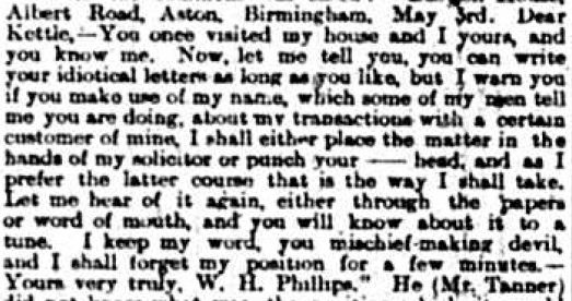 Edgar Kettle, Newman Brothers’ manager, went to the extreme of publishing letters in the newspapers warning customers against aligning themselves with an association that cared more about controlling their profits than looking out for their customers. He warned of the perils this would create for the entire industry and how this artificial control of the market stifled business and would let international trade in. This kind of bad press was clearly damaging for the Association and Kettle was warned off by a staunch member, Mr H Phillips. He not only appeared at Newman Brothers to personally ‘dissuade’ Kettle, but he was also fined £30, around £3,000 today, by Birmingham Police Court, for threatening Edgar in a rather explicit letter: